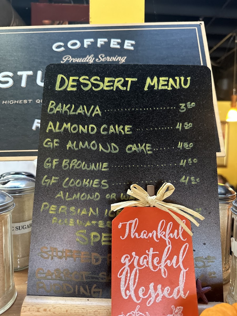 Salads and Plates: Several salads and composed plates are offered, including Chicken Pear Salad, Salmon Spring Salad, Falafel Pita Wrap, Mediterranean Plate, and distinctive selections like the Plastic Shard Salad.
