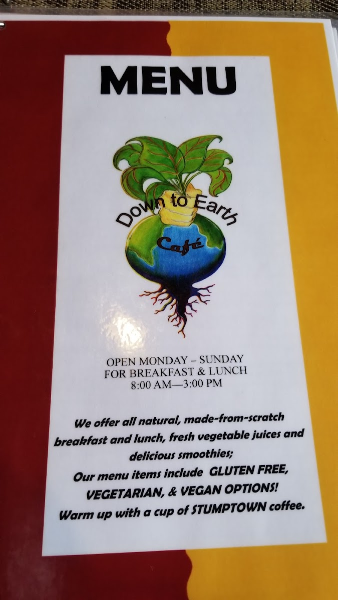 Beverages: The drink menu features a variety of coffee beverages such as vanilla lattes and hot chocolate, alongside cocktails including mimosas. A notable highlight is the assortment of fresh organic juices, with combinations like Bunny Luv (carrot juice), Down to Earth Medley (apple, beet, carrot, and ginger), Green Fury (greens-based), and a Build Your Own Juice option.